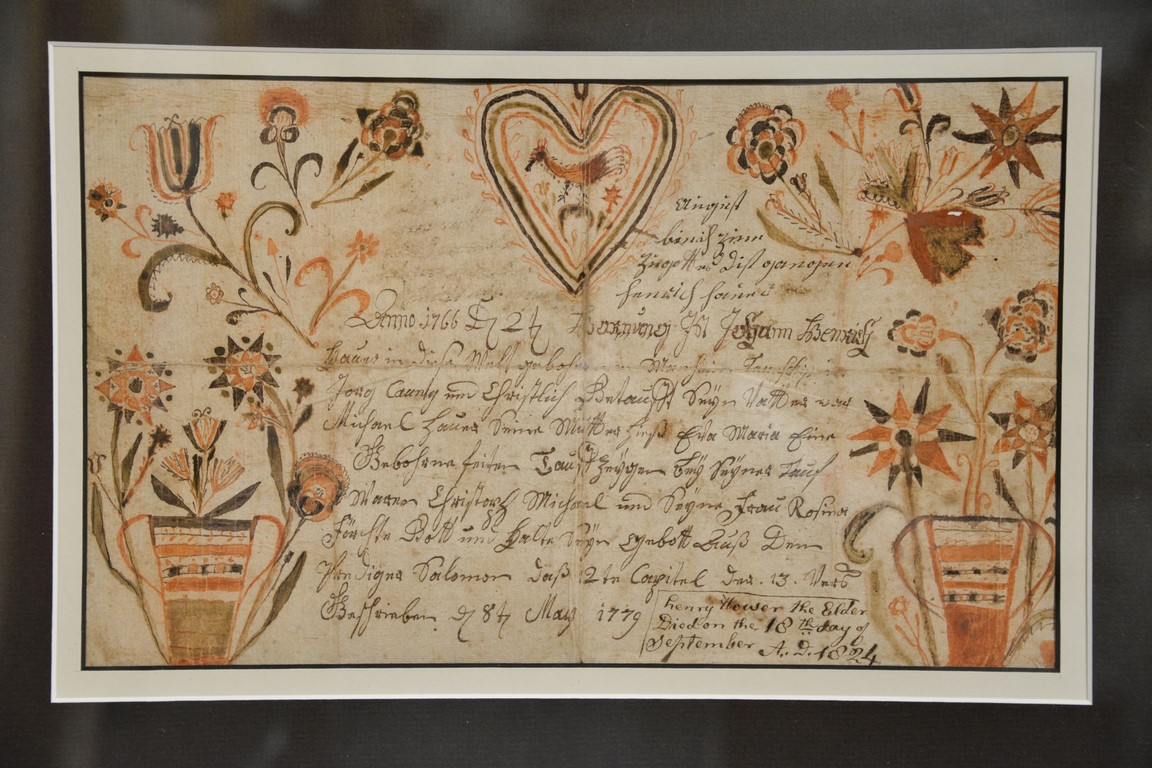 Stoneware 6 gallon butter churn, cobalt blue outline of man and flowers Napoleon’s Tomb stamped Harrington Lyons along with small framed prints. large crack, rim chips, and small cracks height 19 inches Provenance: Estate of Dr. Steve Leder