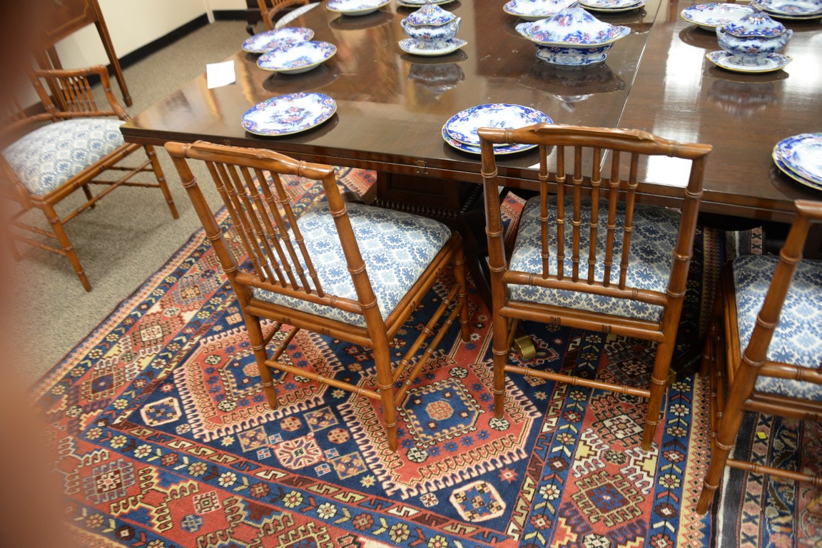 Set of fourteen faux bamboo dining chairs, each with lattice top rail, bamboo style turnings, and upholstered slip seats on bamboo turned legs, includes two armchairs and twelve side chairs.