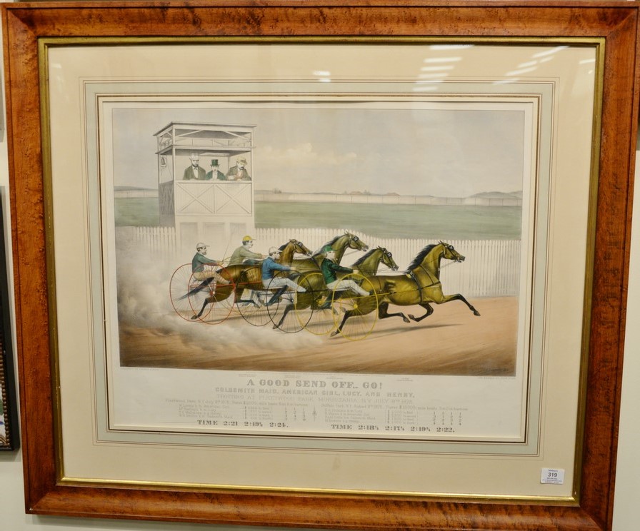 Currier & Ives large folio hand colored lithograph A Good Send off, GO after J. Cameron marked lower left: published by Currier & Ives Donald A. Heald label on verso sight size 21 1/2 x 27 1/4 Provenance: Property from Credit Suisse’s Americana Collection