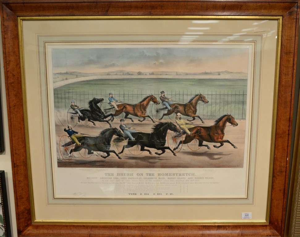Currier & Ives large folio hand colored lithograph The Brush on the Home Stretch after J. Cameron Horse Race on Brooklyn Track marked lower left: lith and published by Currier & Ives sight size 22 x 28 Provenance: Property from Credit Suisse’s Americana Collection