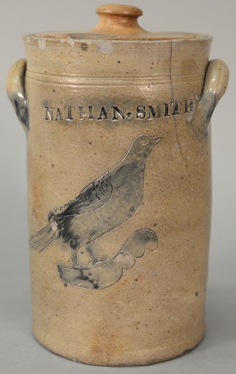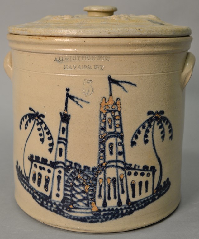 Stoneware five gallon double handle New York crock having impressed mark of A. O. Whittemore Havana N.Y., cobalt decorated with castle and trees along with a molded cover. one rim chip, one rim chip repaired, some blue chips height 11 1/2 inches Provenance: Estate of Dr. Steve Leder