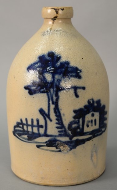 Rare stoneware three gallon jug with cobalt blue house, tree, and fence scene, stamped J & E Norton, Bennington, V.T. rim imperfection and imperfection in blue ground, bottom resurfaced height 15 inches Provenance: Estate of Dr. Steve Leder