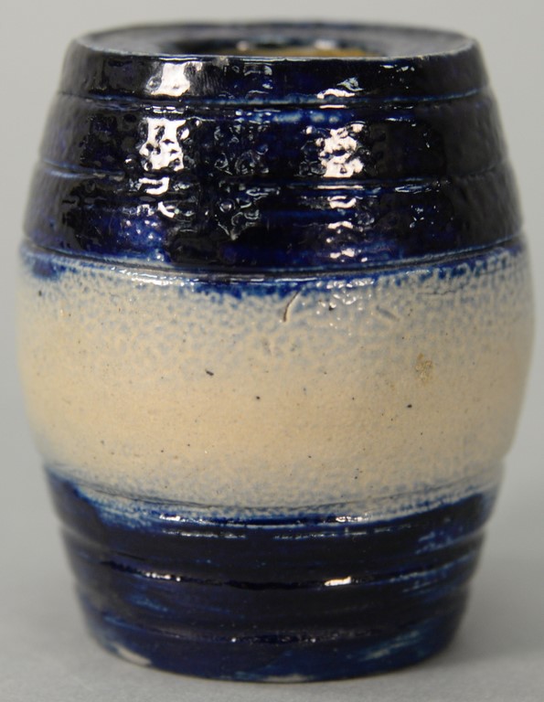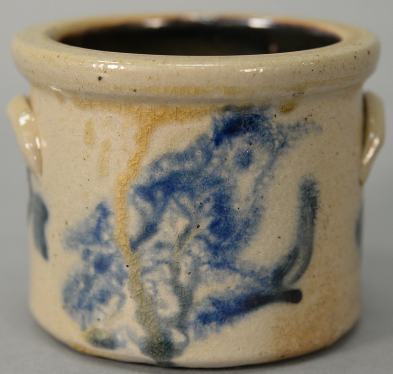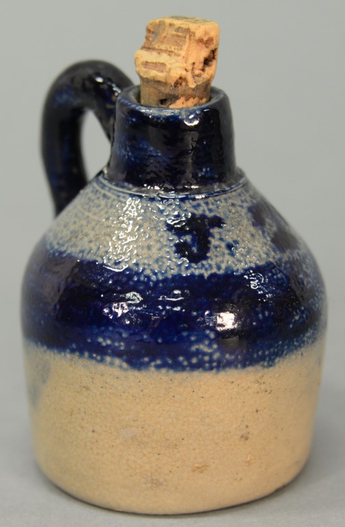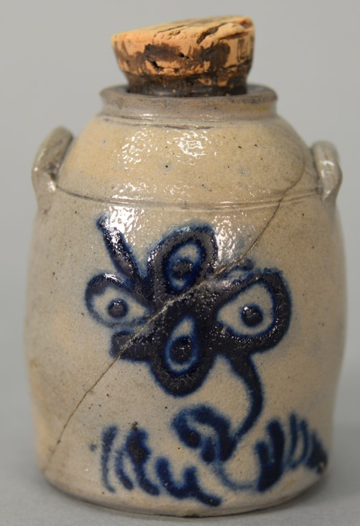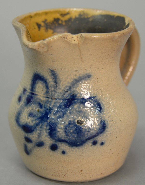 Miniature stoneware pitcher having blue floral decoration and blue spots on handle. rim chips and short hairline cracks height 4 inches Provenance: Estate of Dr. Steve Leder