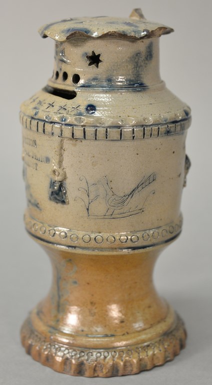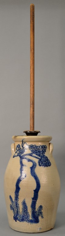 Rare Hart’s Fulton New York five gallon stoneware butter churn impressed Hart’s/Fulton with cobalt blue decorated old man smoking a pipe. tight hairline cracks in back, left front, and near bottom height 17 1/8 inches Provenance: Estate of Dr. Steve Leder