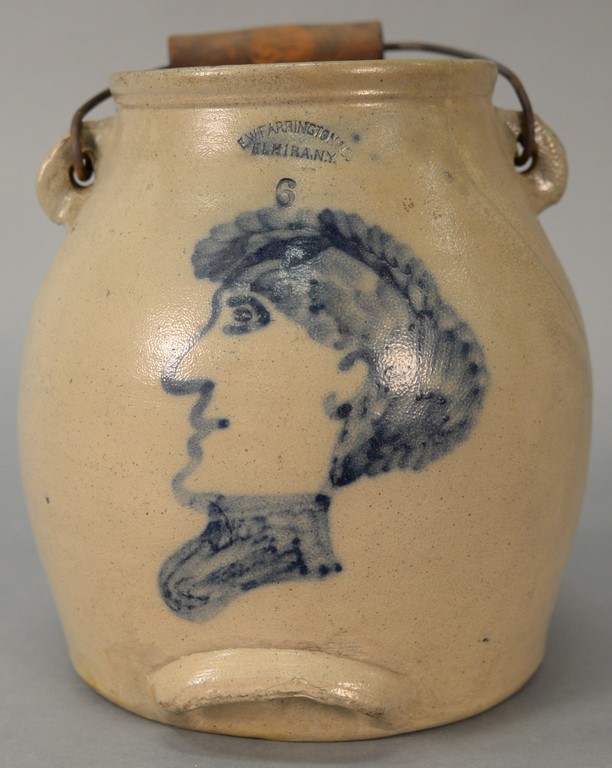 Stoneware cobalt blue decorated batter jug, 6 quart with handle and spout having cobalt blue slip bust portrait of a man, swing handle with wooden grip, stamped E.W. Farrington & Co. Elmira, N.Y. Pictured on the cover of Stoneware Collectors Journal Vol. 5, No. 2. crack and spout chips height 9 1/4 inches, top opening diameter 5 inches Provenance: Estate of Dr. Steve Leder