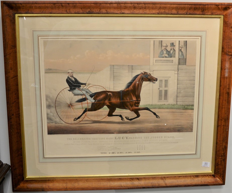 Currier & Ives large folio hand colored lithograph The Celebrated Trotting Mare Lucy, Passing the Judges Stand marked lower left: published by Currier & Ives Donald A. Heald label on verso sight size 21 1/4 x 27 1/2 Provenance: Property from Credit Suisse’s Americana Collection