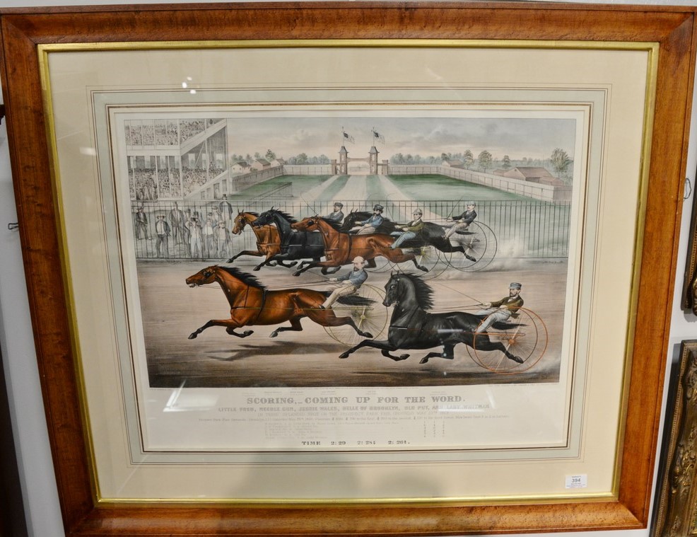 Currier & Ives large folio hand colored lithograph Scoring, – Coming up for the Word Little Fred, Needle Gun, Jessie Wales, Belle of Brooklyn, Old Put, and Lady Whiteman marked lower left: Litho for Currier & Ives Donald A. Heald label on verso sight size 21 1/2 x 27 1/4 Provenance: Property from Credit Suisse’s Americana Collection
