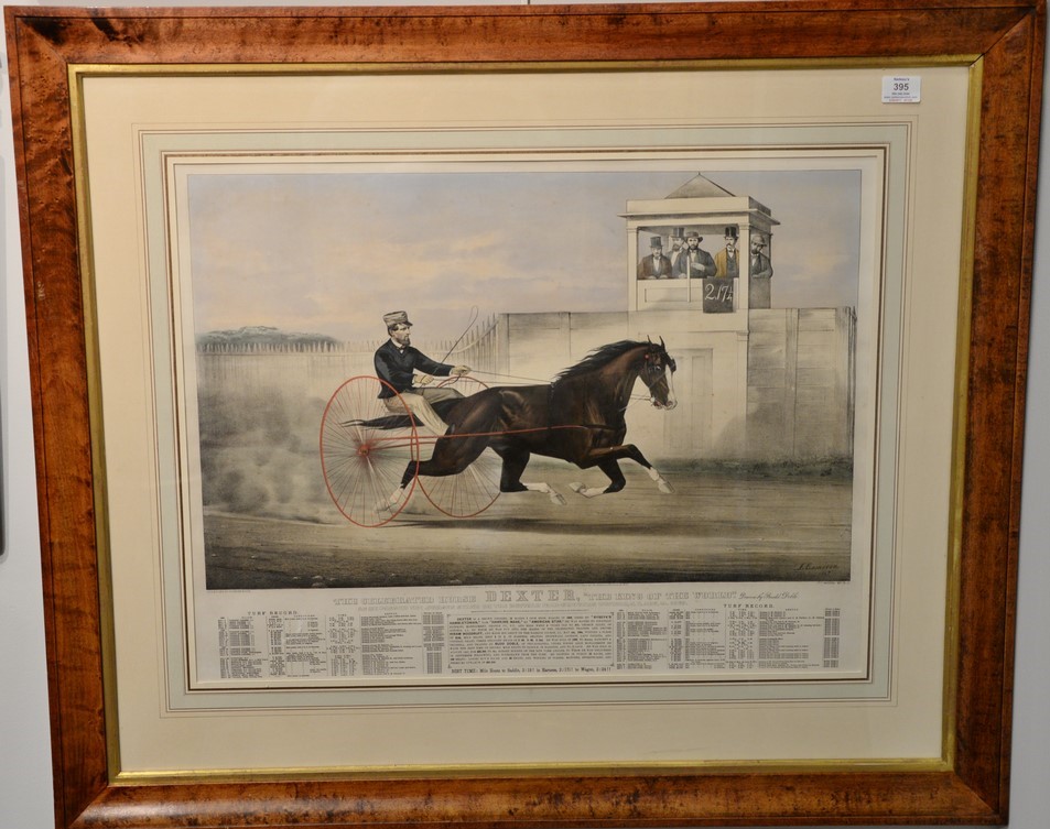 Currier & Ives large folio hand colored lithograph The Celebrated Horse Dexter, The King of the World as he passes the Judge stand on the Buffalo Fair-grounds Buffalo, N.Y. Aug. 14, 1867 after J. Cameron marked lower left: Lith & Pub’d by Currier & Ives sight size 21 1/2 x 27 1/2 Provenance: Property from Credit Suisse’s Americana Collection