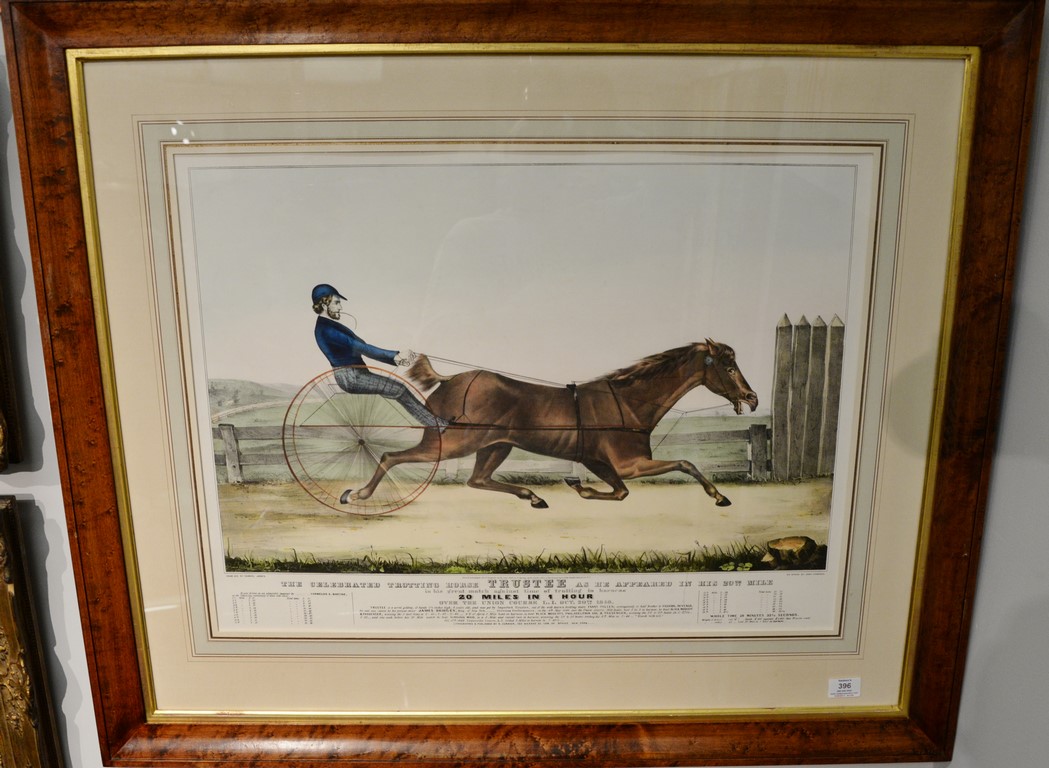 Nathaniel Currier large folio hand colored lithograph The Celebrated Trotting Horse Trustee as he Appeared in his 20th Mile Entered according to act of Congress in the year 1848 by N. Currier marked lower left: Lith & pub by Currier & Ives Donald A. Heald label on verso sight size 21 x 27 3/4 Provenance: Property from Credit Suisse’s Americana Collection