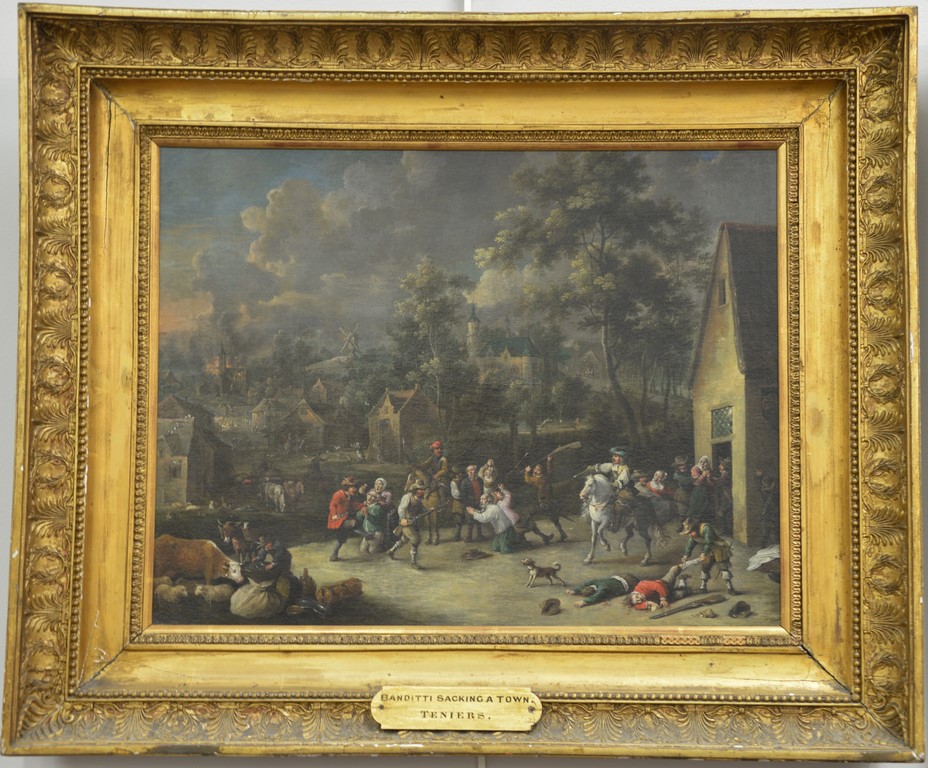 Teniers oil on canvas Banditti Sacking a Town signed lower right: Teniers marked on reverse: The Studio Pictures by Teniers Oct. 2nd 1909 relined 18 x 23