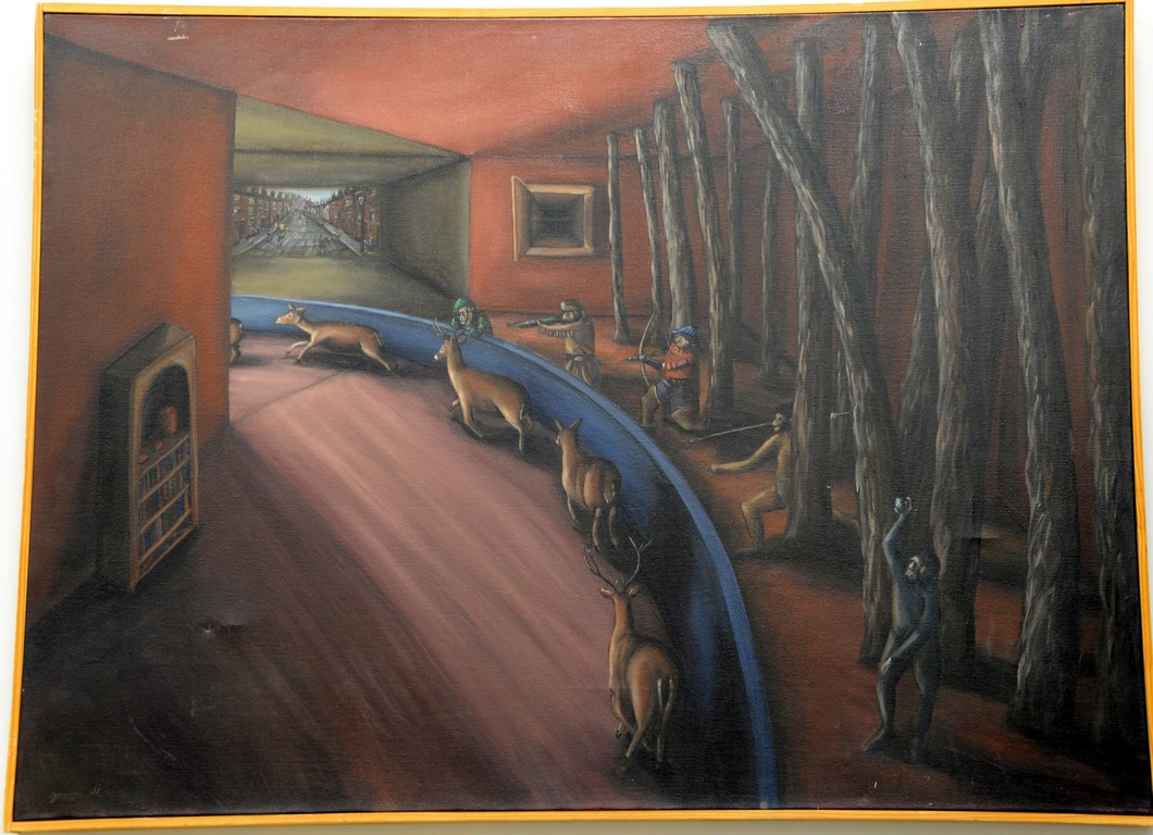 David Kroll oil on canvas The Fear Outside, The Terror Inside 1985 signed and titled on verso Dat Gallery label on verso 29 1/2 x 39 1/2 Provenance: Collection of Ruth and Jerome Siegel