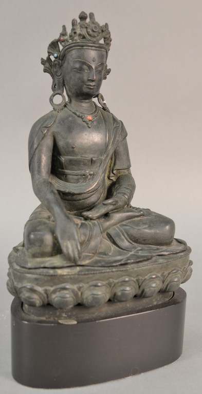 Bronze Buddha on lotus base mounted on wood stand, crown and necklace mounted with stones, probably Nepal 19th century.