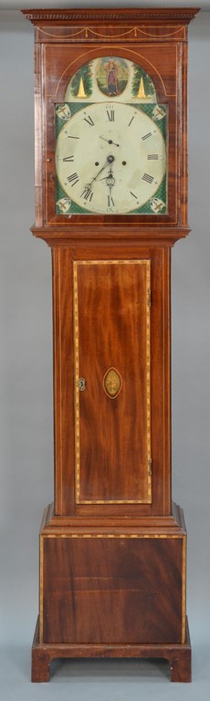 Scottish satinwood inlaid mahogany longcase clock, the dial marked Robertson Glasgow, the polychrome-decorated dial set within a rectangular hood with dentil-molded cornice on a plain stem and trunk, terminating in bracket feet, 19th century and later. height 81 inches