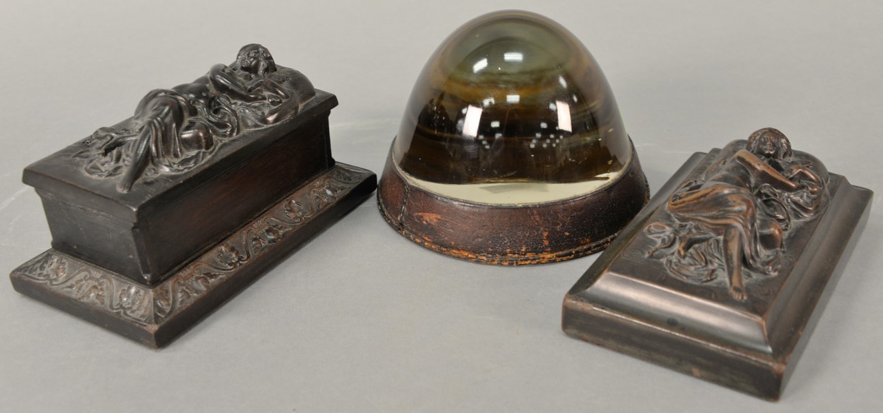 Three piece group to include large glass magnifying glass with leather trim along with two Victorian carved nude women lying with bird one with hinged cover. magnifying glass: diameter 6 1/4 inches figures: lengths 6 3/4 inches and 7 inches Provenance: Estate of Dr. Steve Leder