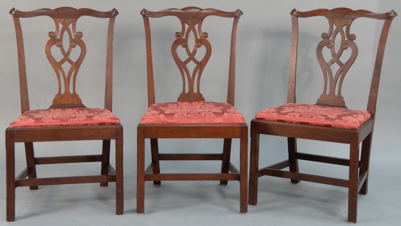 Set of three mahogany Chippendale side chairs having carved and cross thatched crest rail over open carved splat with slip seats all on stop fluted front legs joined by H stretchers, probably Newport Rhode Island, circa 1760. ht. 37 1/2in.