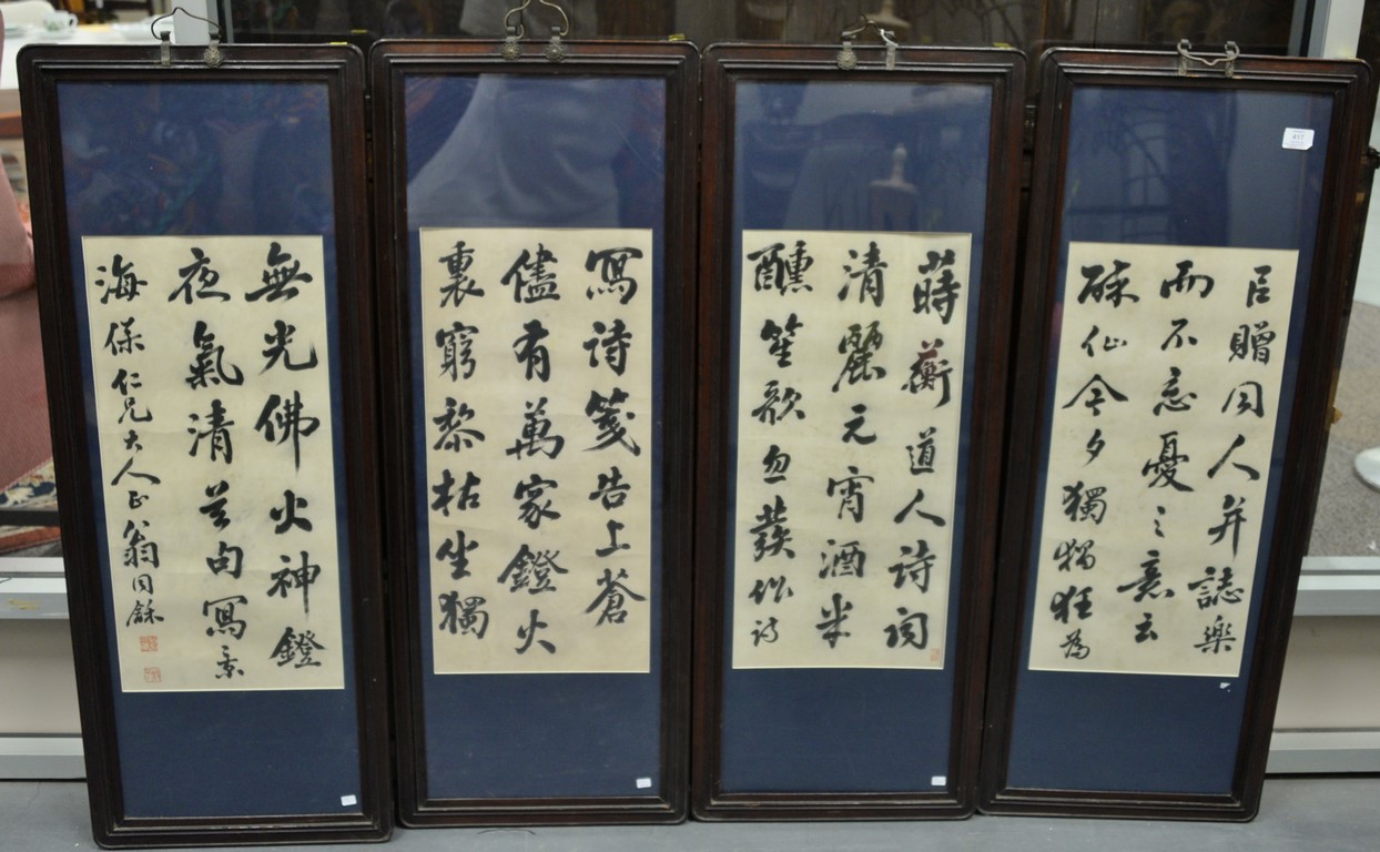 Set of four framed Oriental scrolls, hand painted on paper with characters, seal mark bottom left, in rectangle hardwood frame. sight size 29 1/2 x 17 1/2