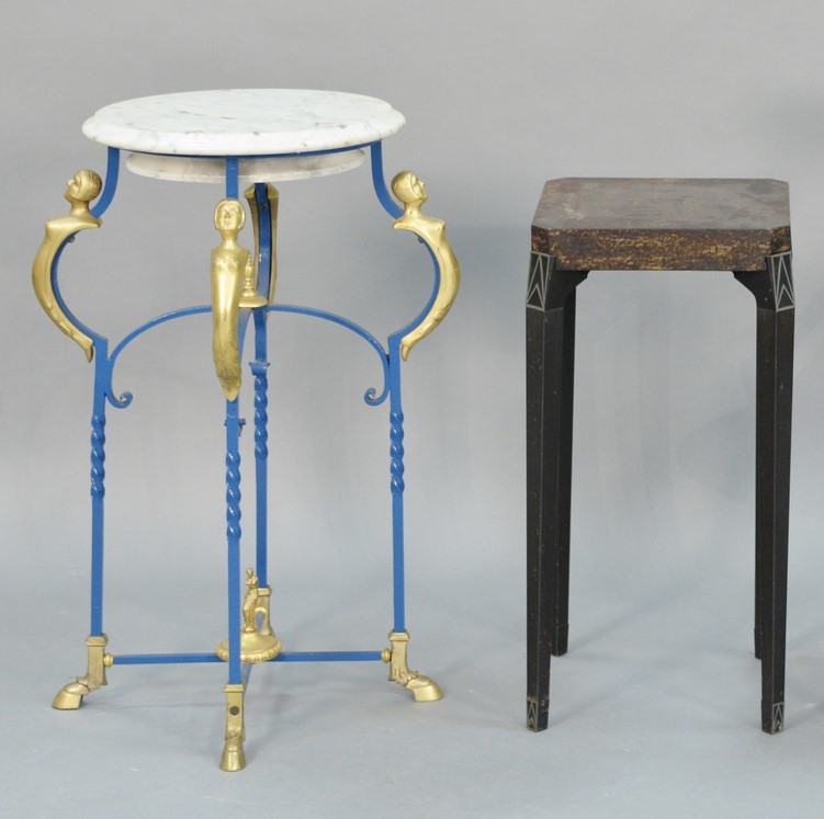 Two piece lot including marble top Neoclassical plant stand and diminutive deco style metal table.
