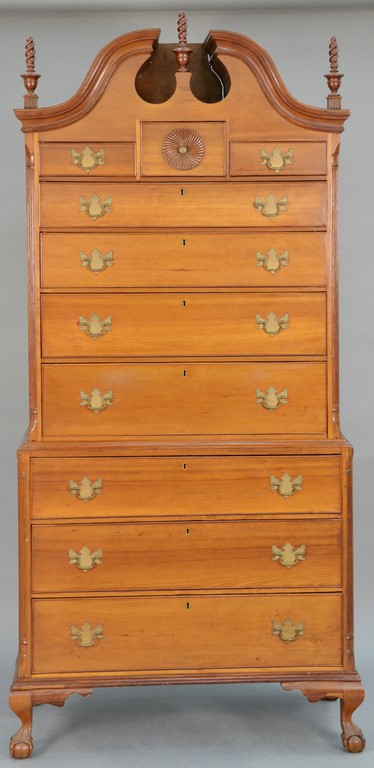 Chippendale cherry chest on chest in two parts, upper portion with full bonnet top and three finials over three short drawers with pinwheel carved center drawer over four drawers on lower section with three drawers all flanked by fluted quarter columns set on short cabriole legs ending in claw and ball feet, attributed to E. Booth, Woodbury, CT, circa 1770. height 88 inches, width 36 1/4 inches