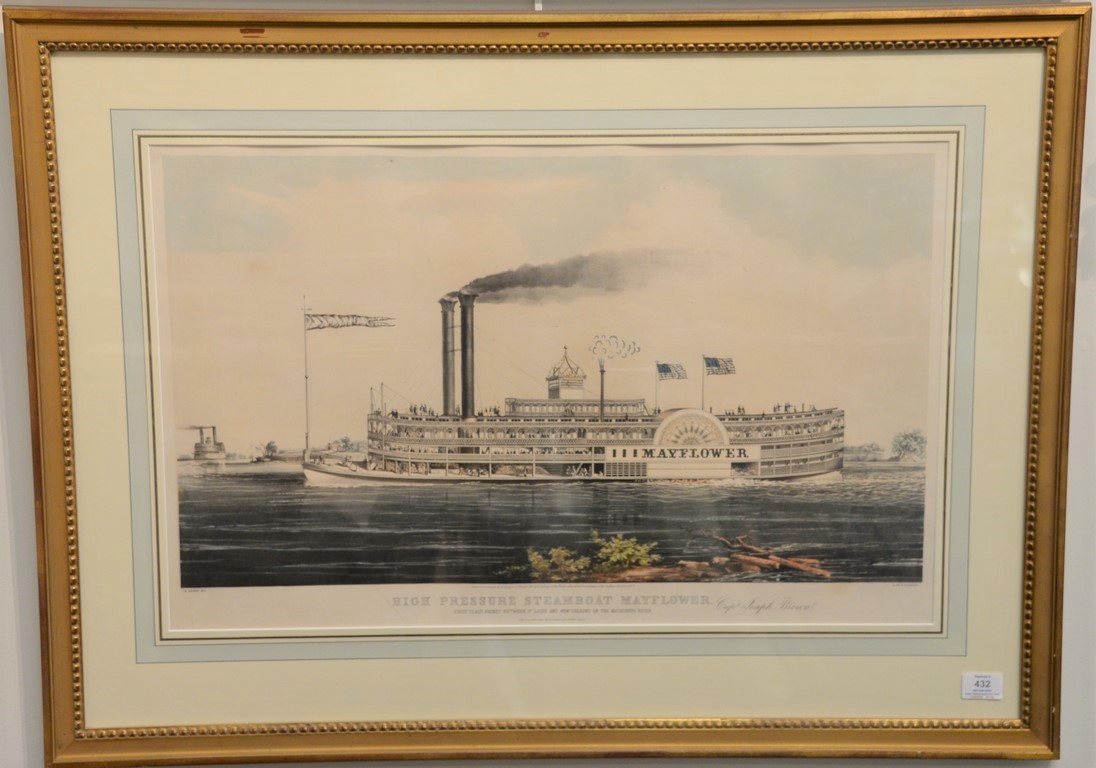 Nathaniel Currier large folio hand colored lithograph High Pressure Steamboat Mayflower Capt. Joseph Brown, First Class packet between St. Louis and New Orleans on the Mississippi River marked lower left: Ch Parsons Del marked lower right: Lith. N. Currier sight size 18 1/4 x 29 Provenance: Property from Credit Suisse’s Americana Collection