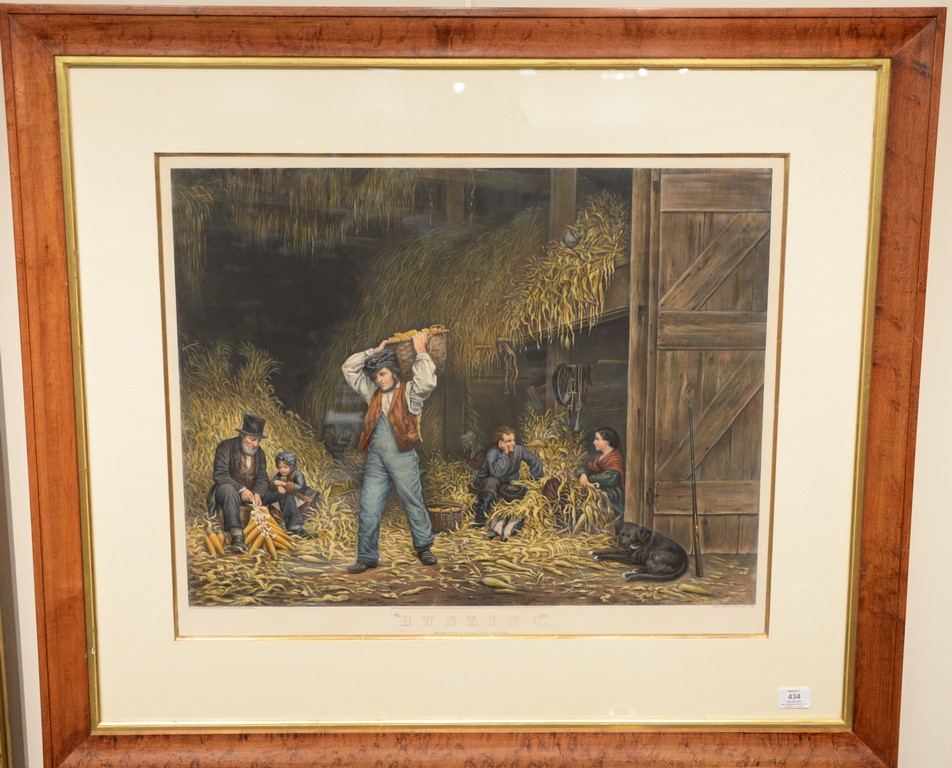 Currier & Ives hand colored lithograph Husking Entered according to act of Congress in the year 1861 marked lower left: Painted by Eastman Johnson on stone by C. Severin marked lower right: Lith Currier & Ives New York sight size 22 3/4 x 28 Provenance: Property from Credit Suisse’s Americana Collection