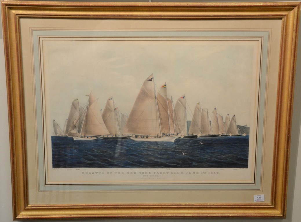 Nathaniel Currier hand colored lithograph Regatta of NY Yacht Club, June 1st 1854 signed in stone lower right: JE Butterworth marked lower left: C. Parsons, Del marked lower right: Lith by N. Currier sight size 20 x 29 Provenance: Property from Credit Suisse’s Americana Collection