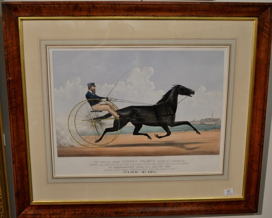 Currier & Ives large folio hand colored lithograph The Trotting Horse George Palmer Driven By C. Champlin after J. Cameron marked lower left: published by Currier & Ives sight size 20 1/2 x 27 Provenance: Property from Credit Suisse’s Americana Collection