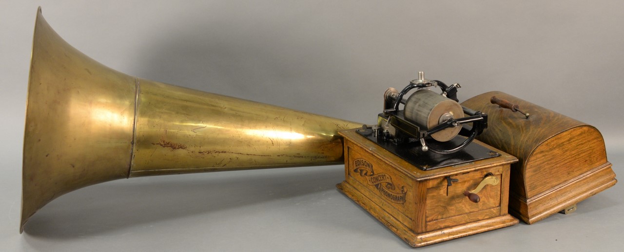 Thomas Edison concert phonograph 1898 cylinder, having oak case and long horn with stand, serial no. C3161.
