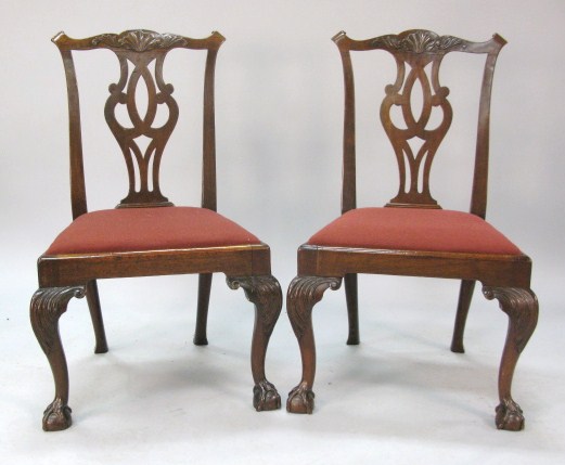 Pair of mahogany Chippendale side chairs with shell covered back, pierced splats slip seats all set on cabriole legs ending and ball and claw feet, Massachusettes, circa 1760.