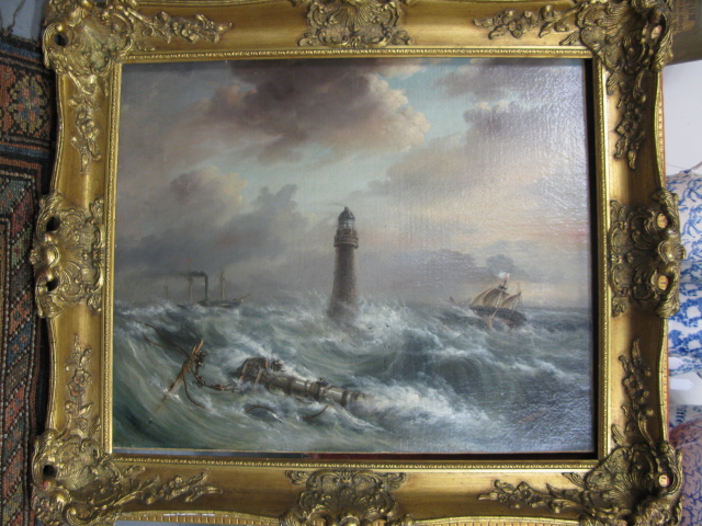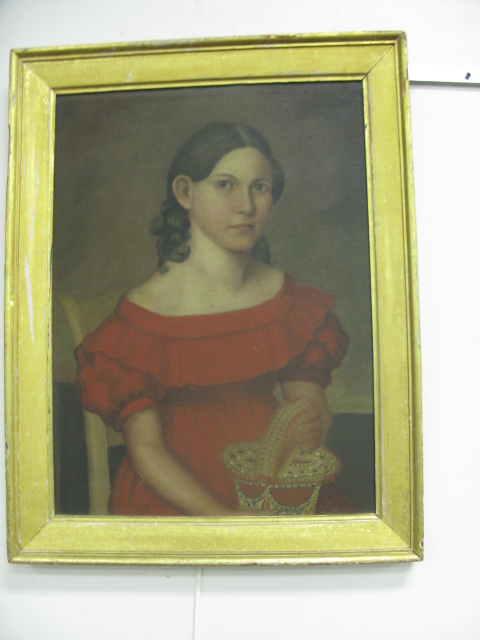 Primitive folk art oil on canvas, portrait of a girl in a red dress, in the original enterprise gilt frame, marked on rear Henry Porter School Farmington, CT.