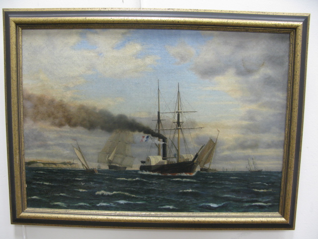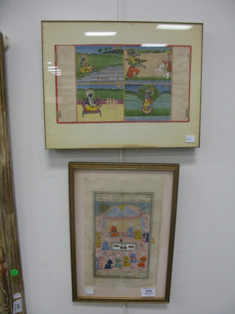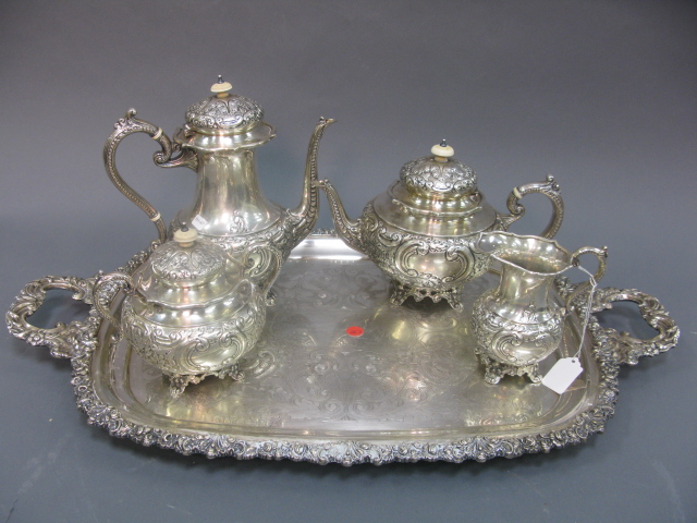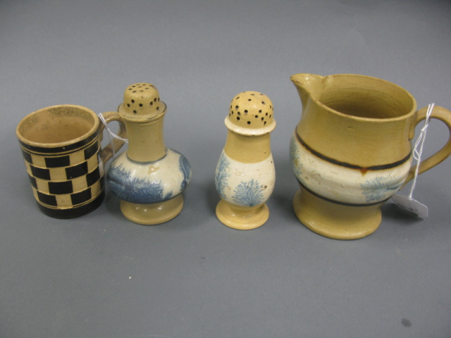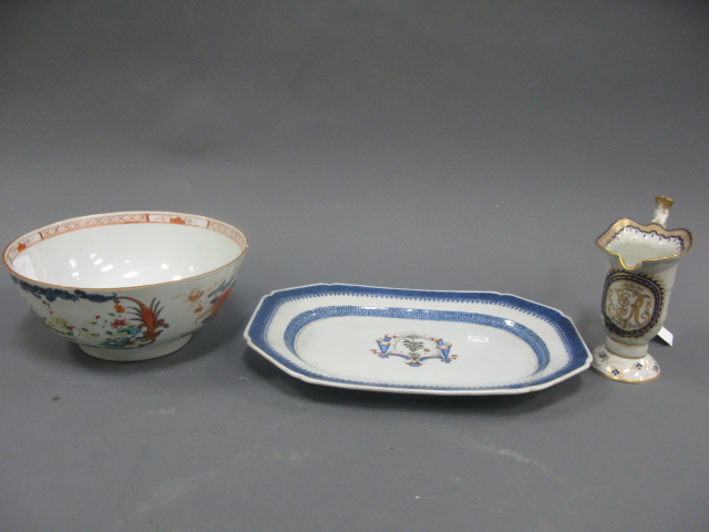 Three piece lot of Chinese export porcelain. Armorial decorated platter and pitcher, each with cobalt decoration and Chinese export porcelain bowl decorated with figures in a landscape, minor rim chip.