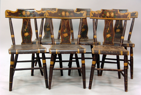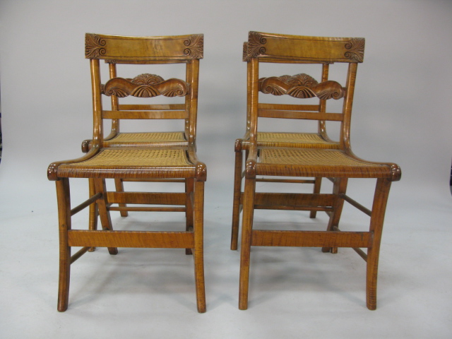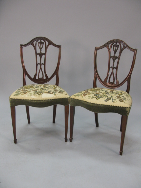 Pair of Federal style mahogany side chairs with pierce urn carved backs shaped fully upholstered seats on square tapered legs ending in spade feet seats in old crewel work.