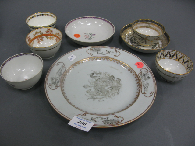 Eight piece lot of Chinese export cups saucers and one plate. Plate has armorial scene, partial identified as Field family, Yorkshire or Hartfordshire.