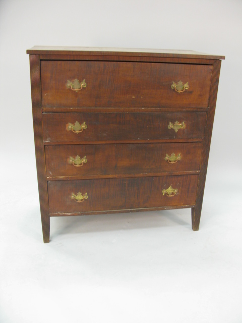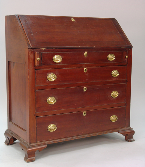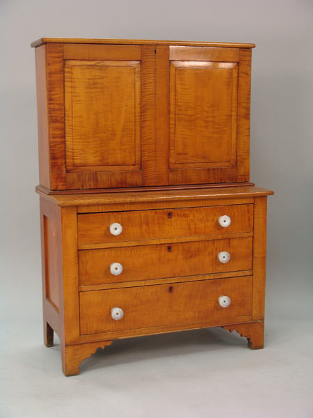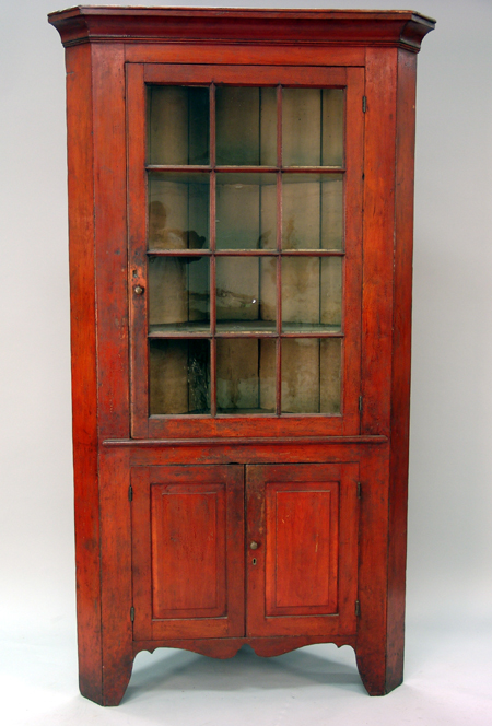 Primitive corner cupboard with large cornice molding over single door with twelve glass panel door over two raised panel doors all set on cutout bracket base, 18th century.