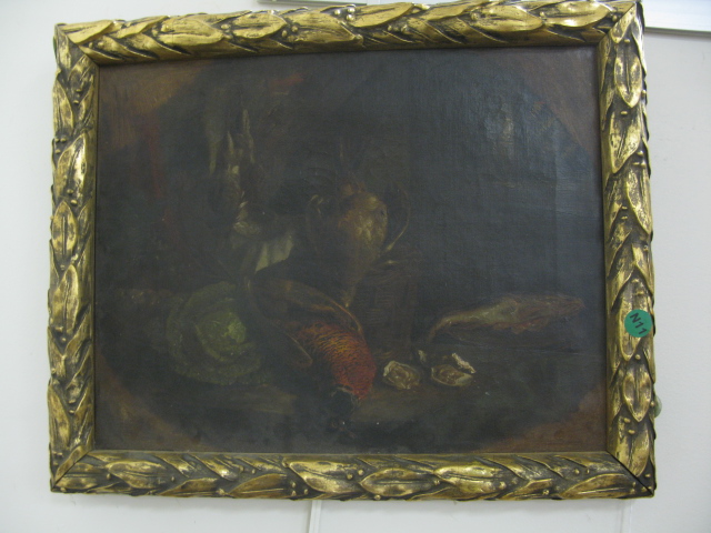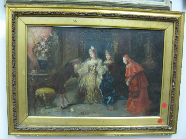 Oil on wood panel, interior scene with seated young woman peeling vegetables with fireplace and cat by her side, signed lower right indistinctly, probably Dutch School, writing on reverse.
