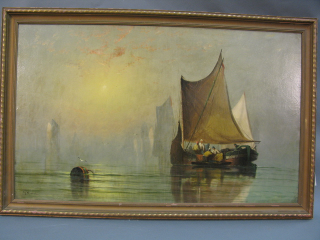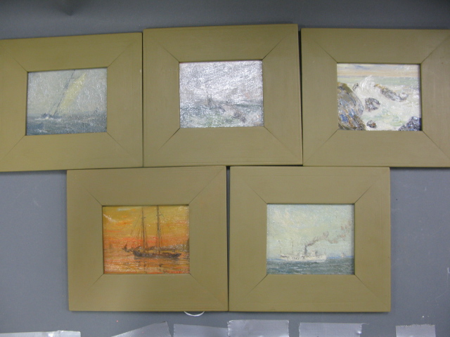 Oscar Anderson 1873-1953 Title Set of 5 Oil on board: Sailing Storm The white boat Calm. One is unsigned and one is signed Oscar Anderson on lower right.