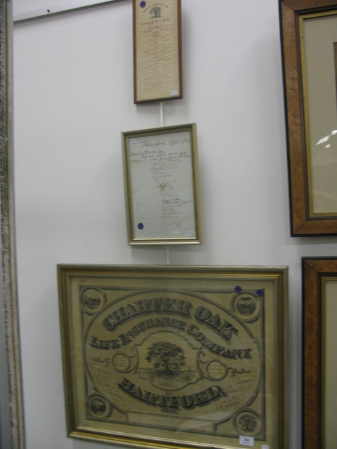Three piece Charter Oak Life Insurance Company of Hartford 19th century broadside with names of officers, along with dinner menu for Charter Oak, 1868 and 1875 handwritten signatures of officers.