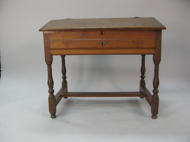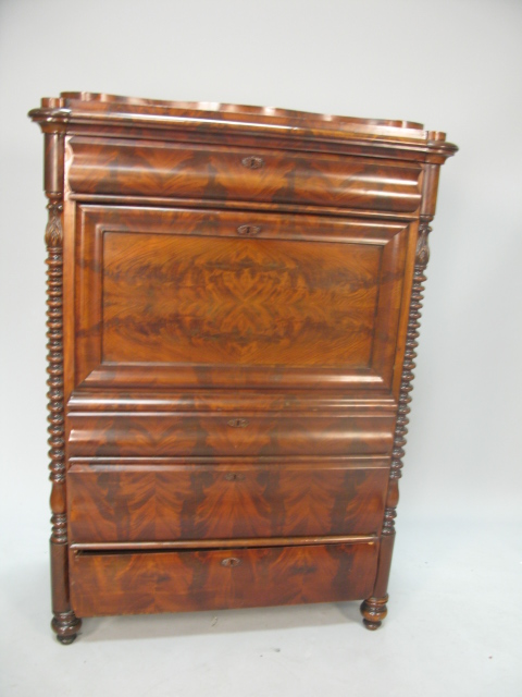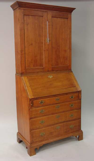 Chippendale maple and tiger maple Secretary Desk in two parts upper section with two blind doors lower section with slant lid over four drawers on bracket base.