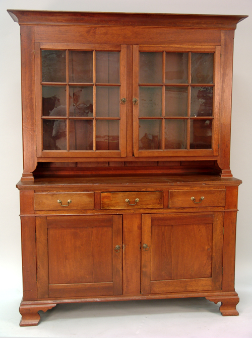 Chippendale cherry stepback cupboard in two parts, upper section with large cornice molding over two glass doors, on lower section of three drawers over two doors, all set on ogee bracket base, 18th century.
