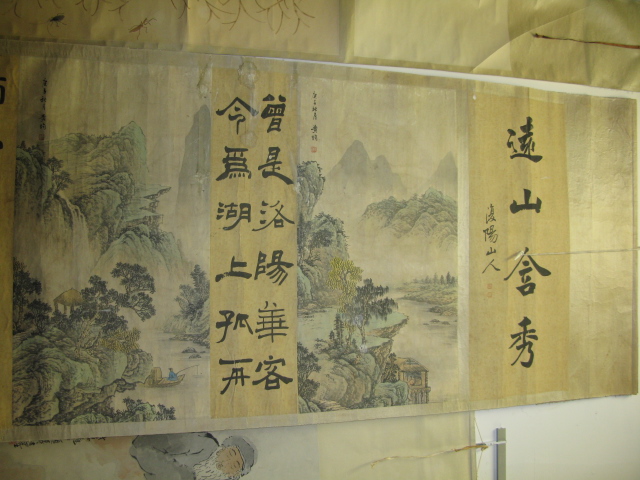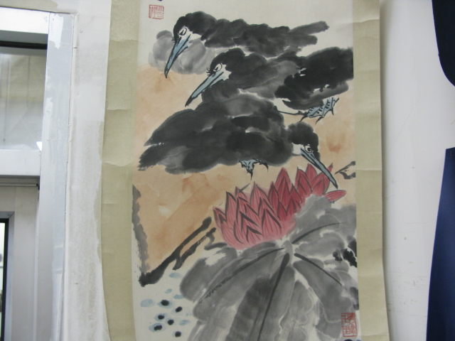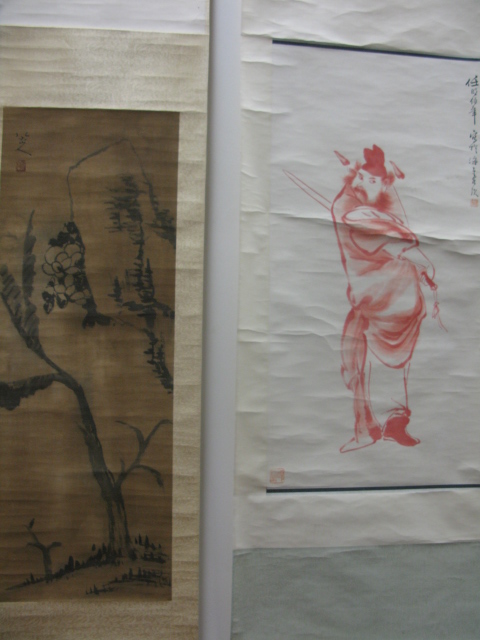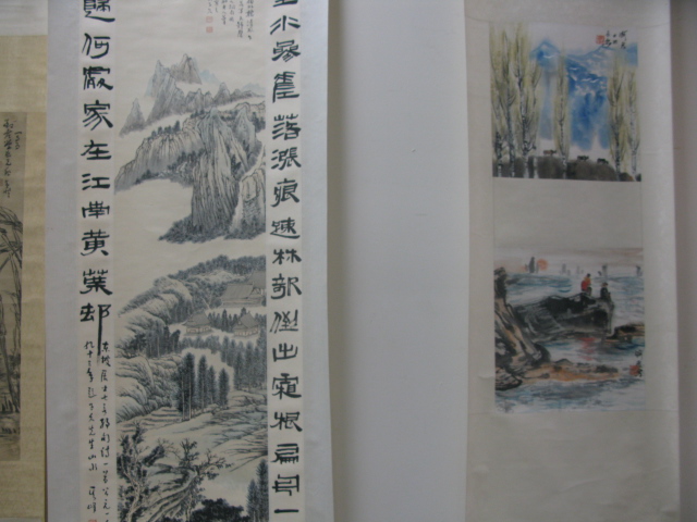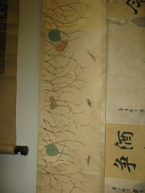 Oriental scroll black and white mountainous scene along with a horizontal scroll with insects on it.