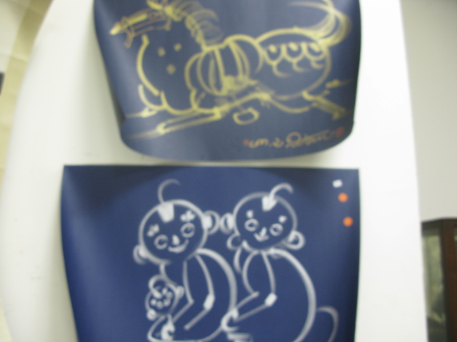 Two Oriental paintings on blue paper, one with monkeys and one with galloping horse.