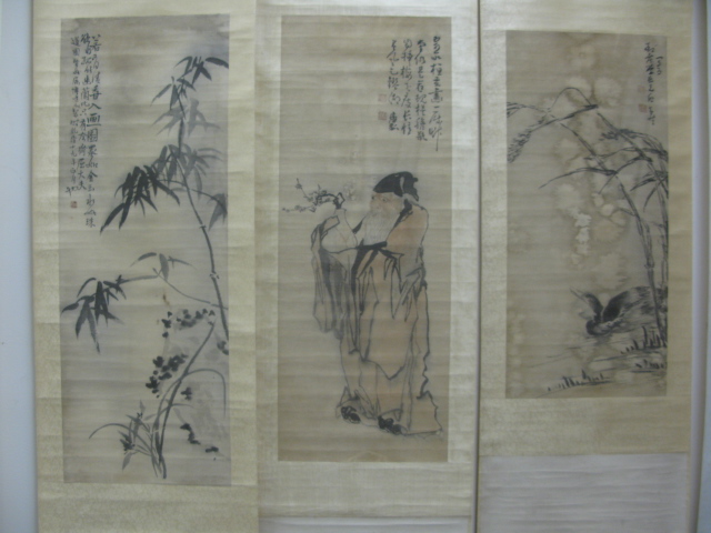 Group of three Oriental scrolls bamboo tree, scholar holding vase and duck on pond’s edge.