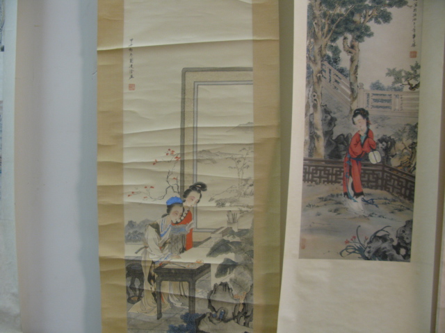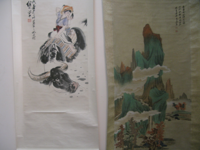 Two Oriental scrolls, one large spring landscape and one two girl figures riding bull.