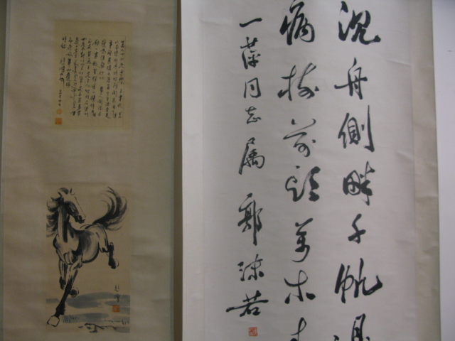 Two Oriental scrolls, one with characters and other is two panels with galloping horse and characters.
