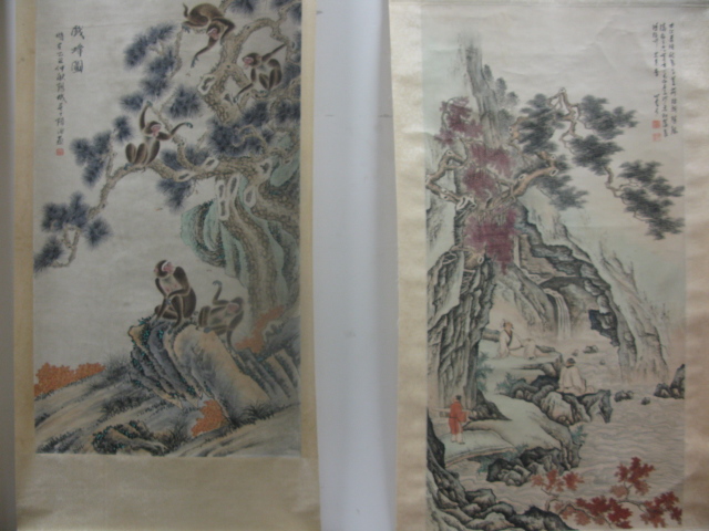 Two Oriental scrolls, one with monkeys playing in tree and one with landscape of trees.
