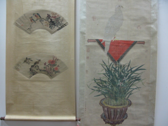 Two Oriental scrolls, one with two mounted fans and one with bird perched above potted plant.