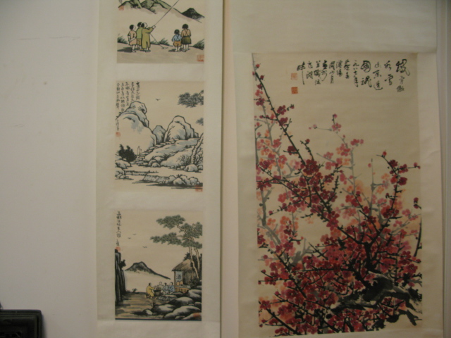 Two Oriental scrolls, one having three small paintings and one with blossoming apple tree.
