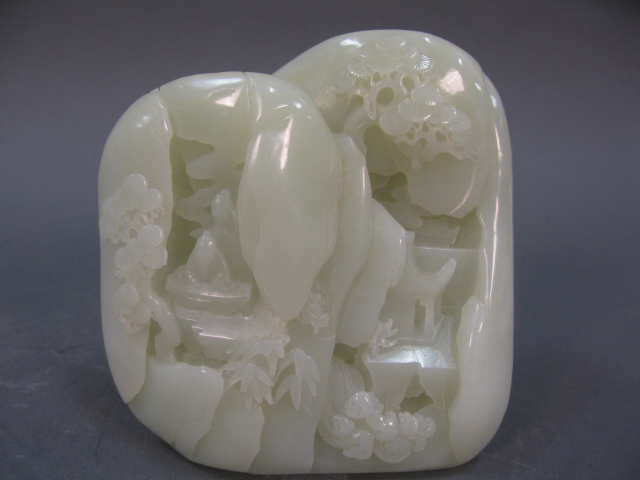 Celadon jade boulder carved in the form of a landscape with a house and trees.