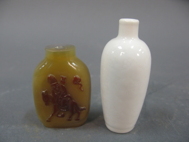 Two snuff bottles one carved agate and one white Oriental porcelain.