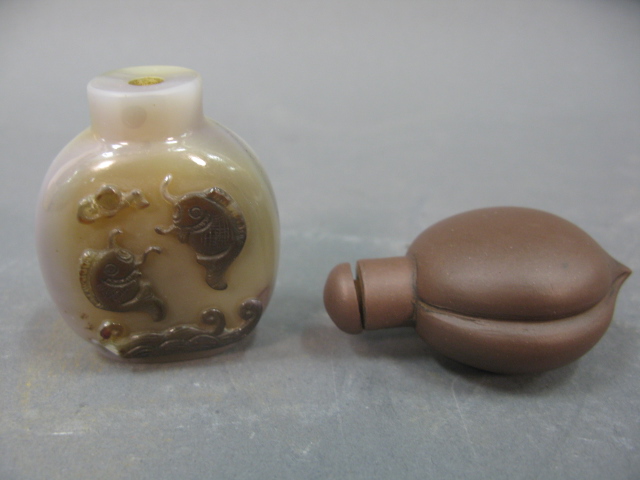 Two snuff bottles one carved agate with leaping fish and one red ware.