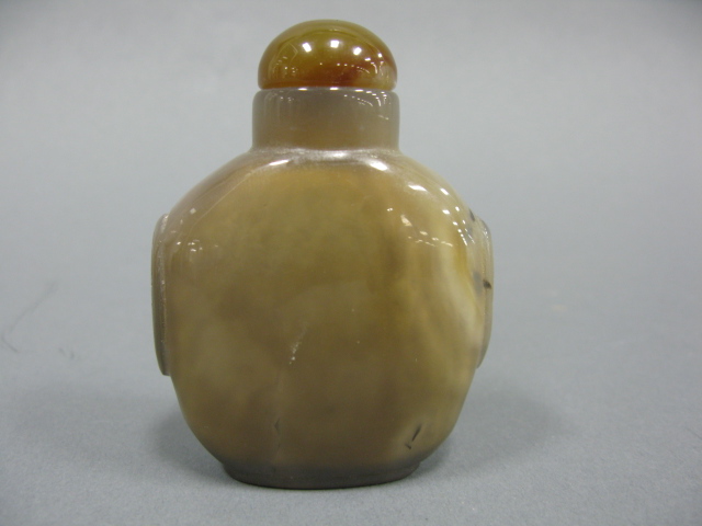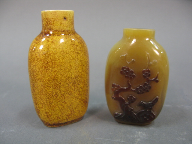 Two snuff bottles one carved agate with tree and bird and one brown glazed pottery.